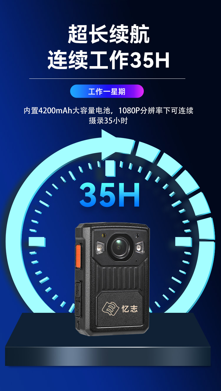 ●续航能力强,内置4200mAh大容量电池,1080P分辨率下连续摄录约35小时。